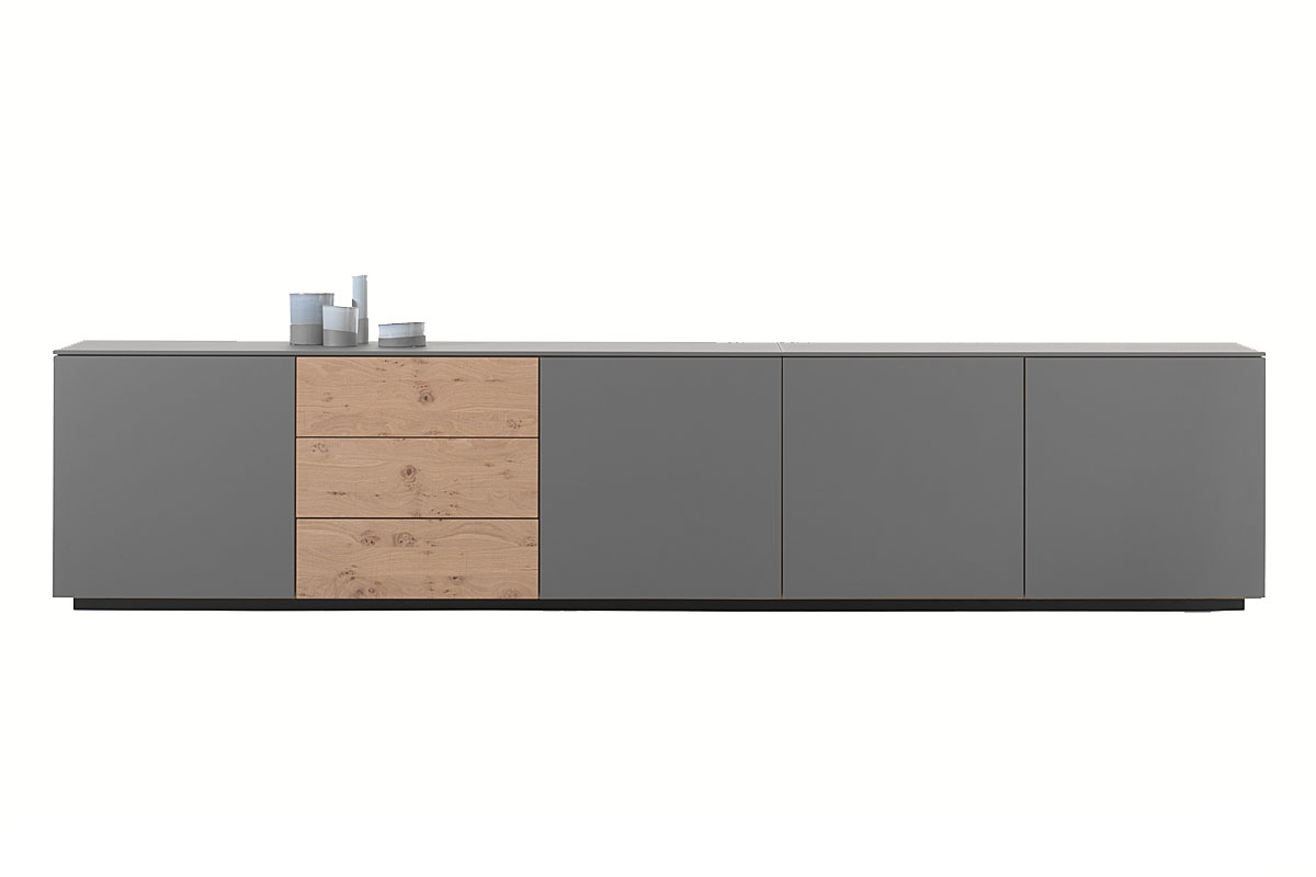 Het Cas dressoir biedt diverse indelingsmogelijkheden, waaronder open vakken, lades en deuren.
