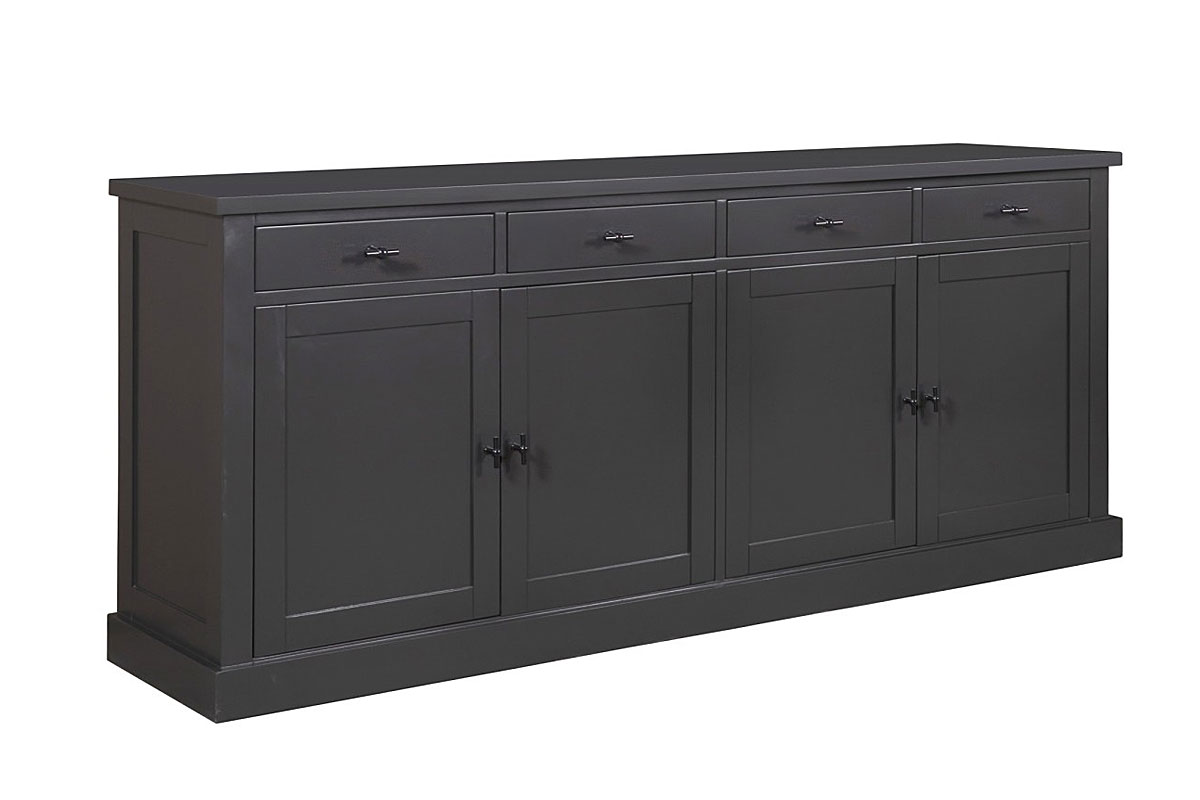 De metalen accenten, afgewerkt in een zwarte tint, accentueren het industriële karakter van het dressoir.