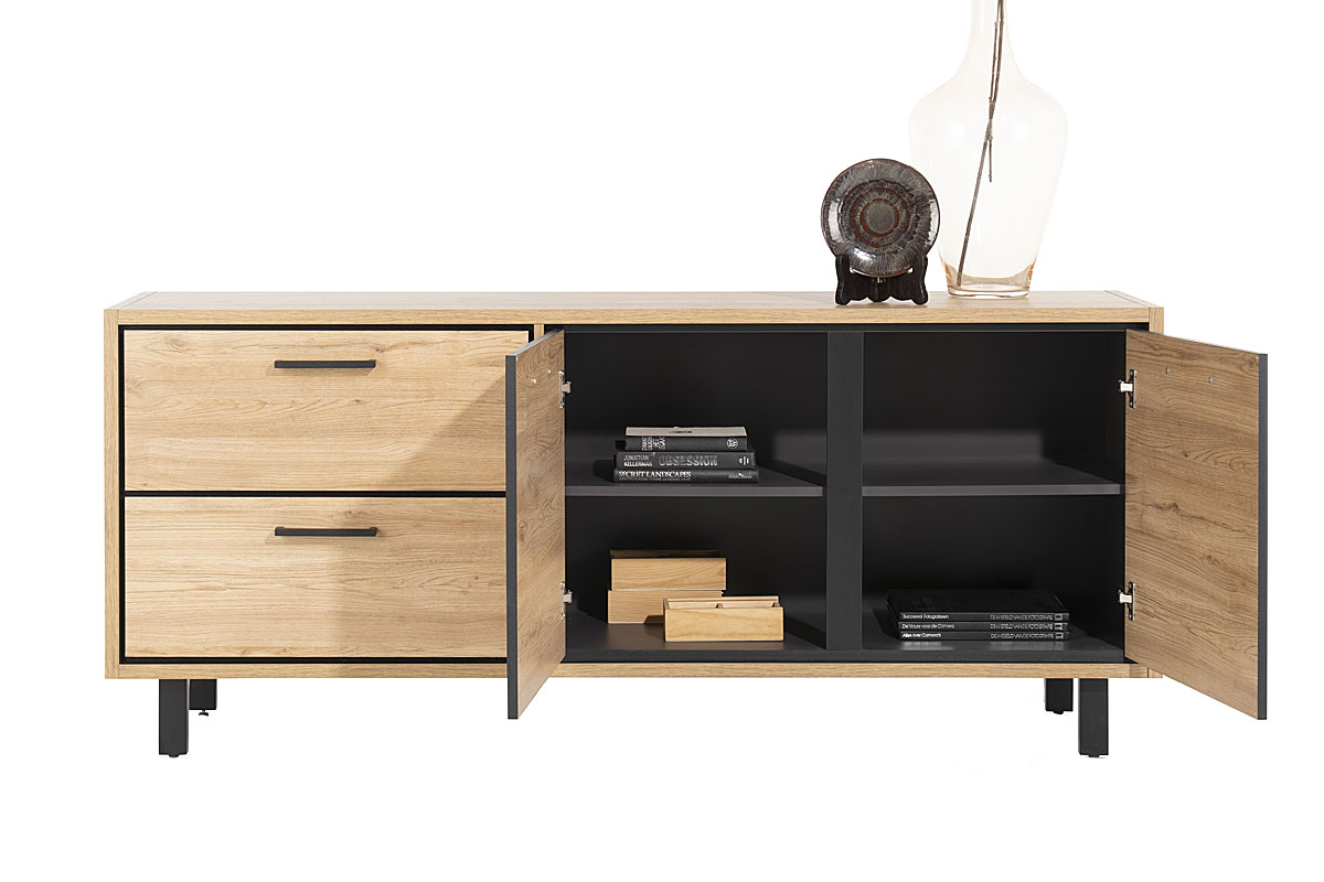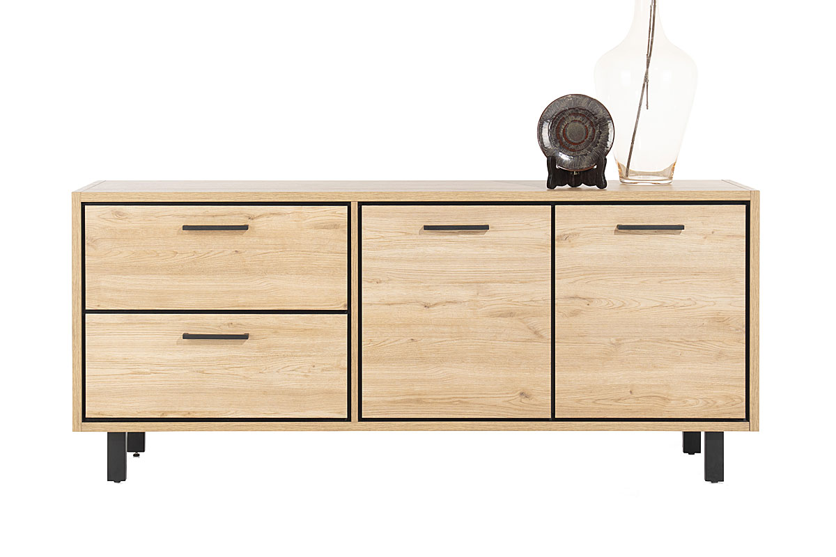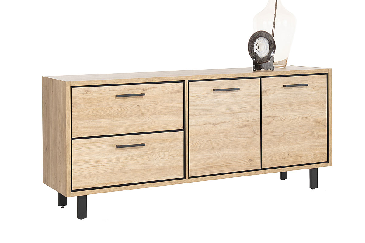 Het dressoir combineert natuurlijke houttinten met strakke metalen details, passend bij een modern, industrieel of Scandinavisch interieur. Het ingetogen ontwerp zorgt ervoor dat het meubel zich moeiteloos integreert in verschillende stijlen.